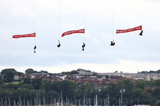The Greenpeace climbers abseiled from beneath the bridge’s service walkway, unfurling six giant “Plastics Treaty Now”’ banners.