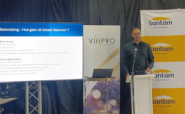 Before investing in solar energy, farmers should carefully review their electricity bills and usage patterns to avoid unnecessary costs and mistakes. This was the message from Gerrit Germishuys, sales manager at International Utility Brokers, during his talk at Vinpro’s ‘Practical Solutions for Today’s Farmer’ information session at Nampo Cape.