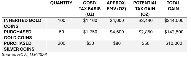 If Client X sells all the non-inherited coins, their tax gain will be approximately $152,500 based on recent spot prices. Note that coins issued by the U.S. Mint (and other foreign mints) typically trade at a premium compared to “blanks” (non-legal coins) and bullion, averaging approximately $8 to $10 per ounce for silver and 5% to 8% for gold.