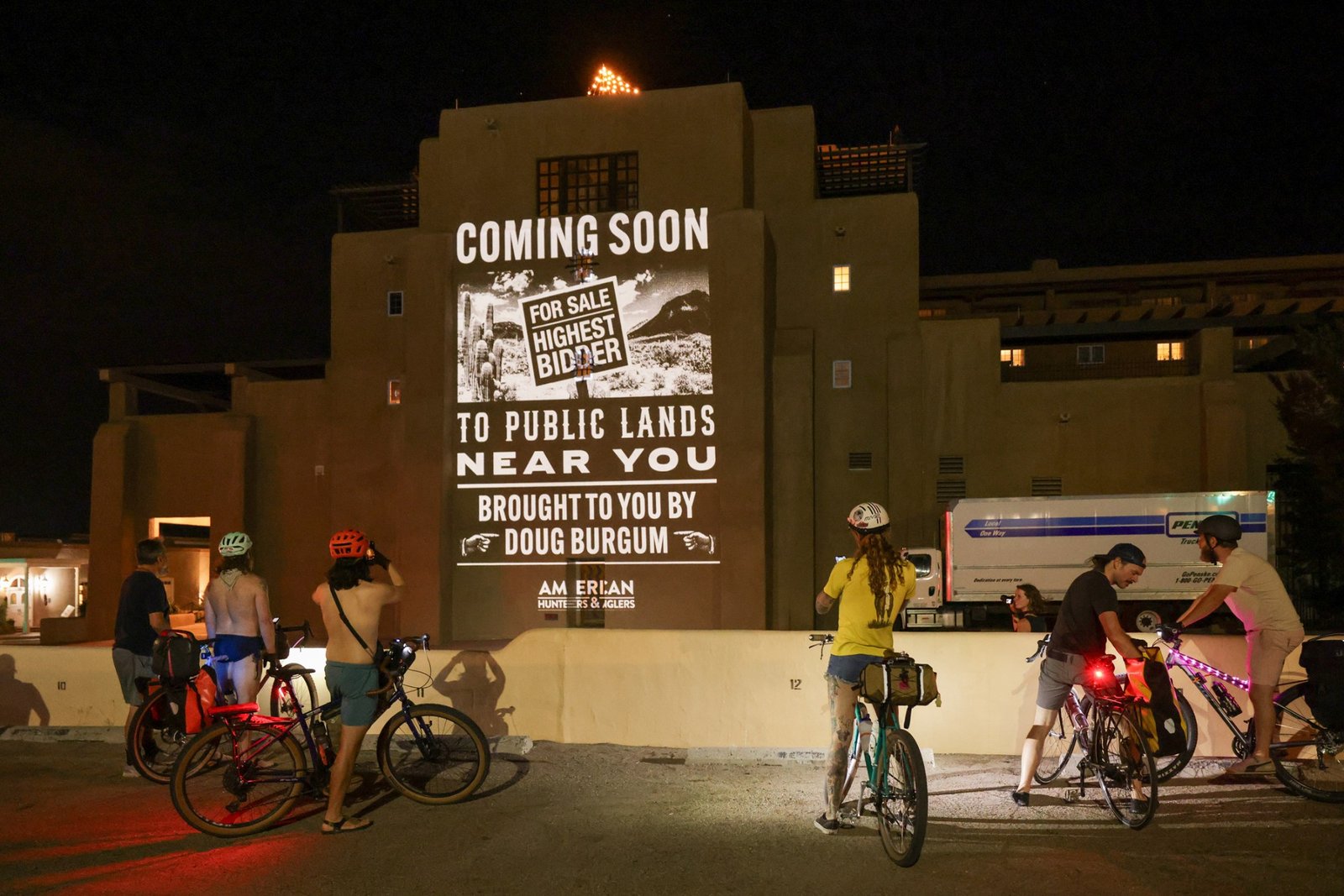 Meanwhile, back at the Eldorado, the American Hunters & Anglers Action Network were projecting an image of a red-eyed Burgum on one of the hotel’s exterior walls, captioned “PUBLIC LANDS BURGLED BY BURGUM”.