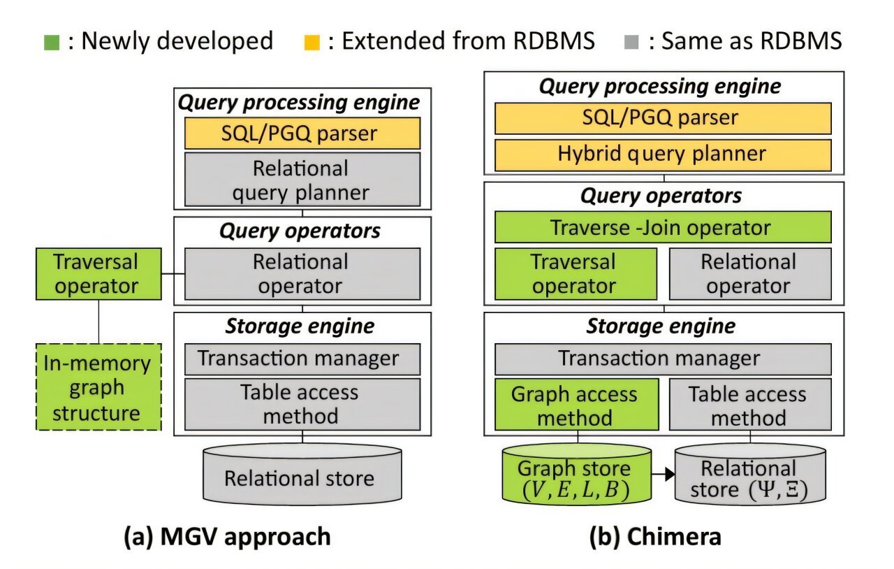 (a) Typical architecture of a graph query processing system based on a traditional RDBMS. (b) Chimera’s integrated architecture. Credit: Proceedings of the VLDB Endowment (2025). DOI: 10.14778/3705829.3705845