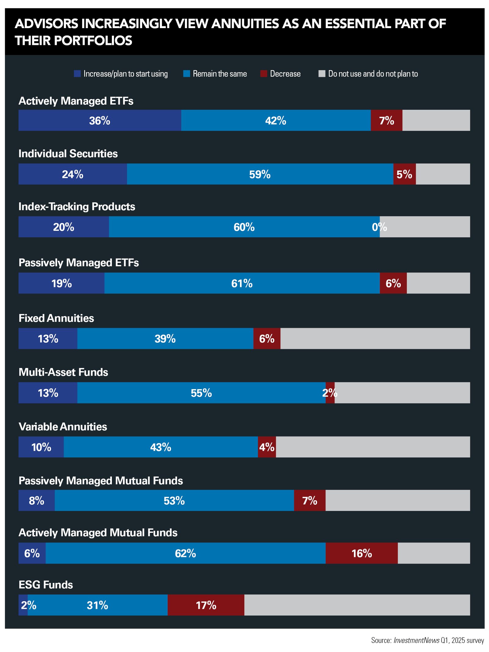 Investors looking for more of a guaranteed income stream will prefer fixed-income annuities (FIAs) that offer principal protection with returns ranging from 4 percent to 8 percent annually. Fixed index annuity sales fell 7% year over year to $26.7 billion in the first quarter of 2025 but still ranked as LIMRA’s fifth-highest recorded quarter in history. “Because of how the markets worked, fixed index annuities are priced the best for guaranteed income today in many scenarios,” says Druvenga.