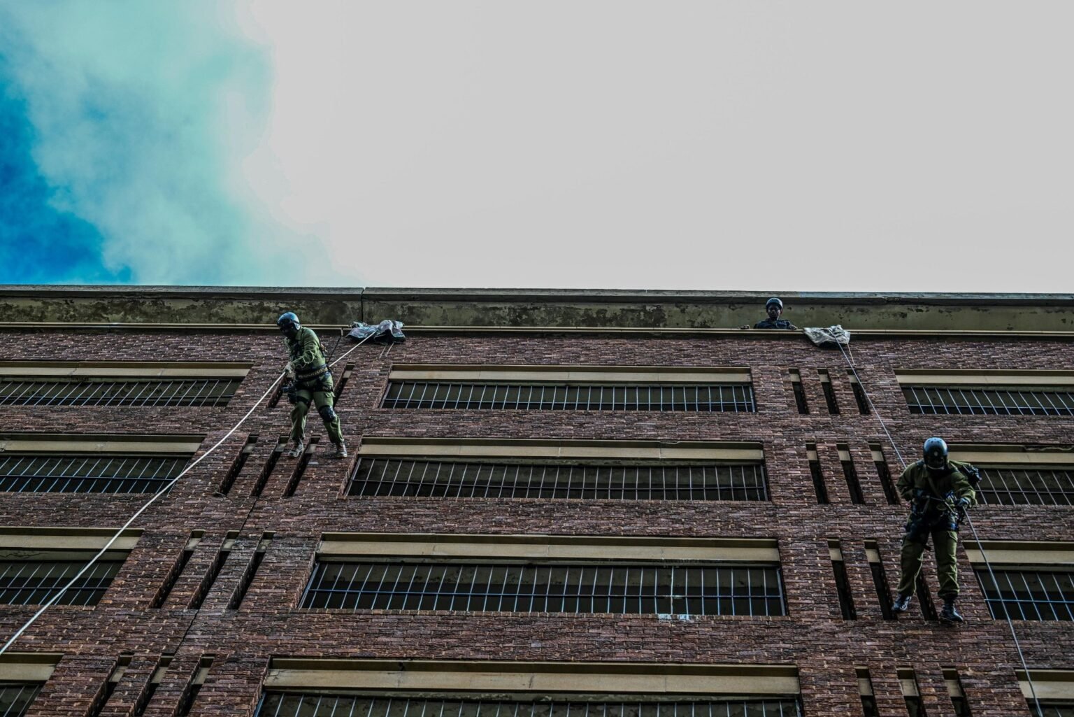The hands-on part saw work dress wearing officers of the law start on the outside of a multi-storey building in Thaba Tshwane on 2 December, fine-tuning their fast roping skills before heading north-east to the Wallmannsthal military area for more hands-on military skills training to augment their legal knowledge. Seven defence law practitioners enrolled in what is termed the Executive Leadership Course by Thando Ramasimong from Defence Corporate Communication (DCC) took on specialised, high risk military tasks. Among these were clearing buildings and demolishing structures.