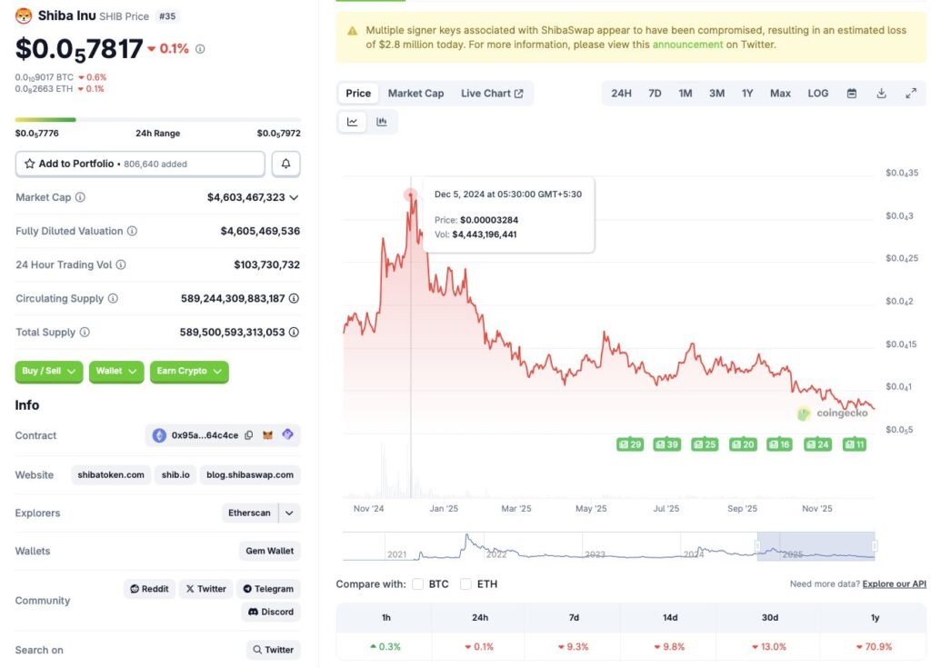 Shiba Inu (SHIB) has seen a gradual price decline since December of last year. The popular dog-themed crypto has struggled to gain momentum in 2025. The asset’s troubles deepened after the October market correction. According to CoinGecko’s Shiba Inu data, SHIB’s price has fallen 0.1% in the last 24 hours, 9.3% in the last week 9.8% in the 14-day charts, 13% over the previous month, and 70.9% since December 2024. In this price prediction article, let’s discuss how much lower Shiba Inu (SHIB) may dip before entering a rally.