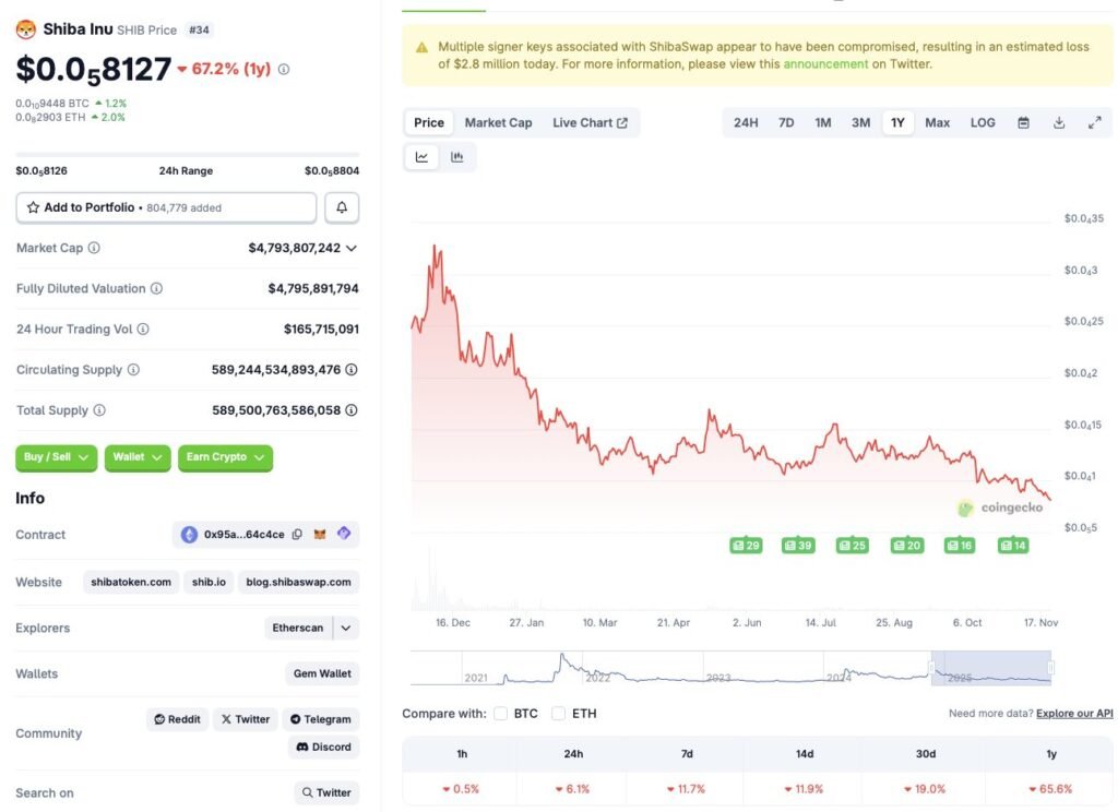 Shiba Inu’s price crash has further deepened over the last 24 hours. According to CoinGecko’s Shiba Inu data, SHIB’s price has fallen 6.1% in the last 24 hours, 11.7% in the last week, 11.9% in the 14-day charts, 19% over the previous month, and 65.6% since November 2024. The popular crypto was once among the best-performing assets in the market. Let’s discuss if SHIB will fall further, and if you should buy the dip.