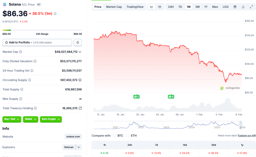 Solana (SOL) hit a new all-time high of $293.31 in January 2025. However, the asset’s price has fallen by more than 70% since its 2025 peak. While the price dip is concerning, it could also present an excellent opportunity for big gains in the future.