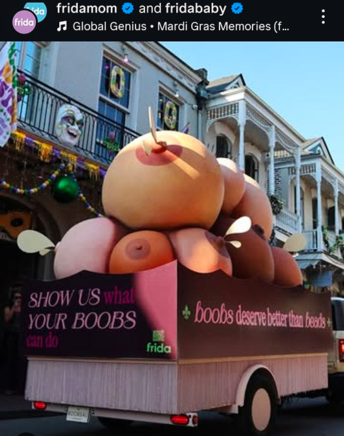 Another marketing stunt involved a truck full of breasts during Mardi Gras. The back of the trailer says, “Show us what your boobs can do.” However, from afar, we only see “Show us your boobs,” which is what drunk guys yell at girls during Mardi Gras. A strange venue to promote baby products.