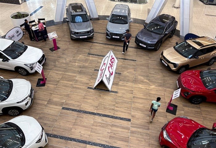 File photo: Customers browse a selection of cars displayed for sale at an entrance of a shopping mall, in Johannesburg, South Africa, 27 August 2025. Reuters/Siphiwe Sibeko/File Photo