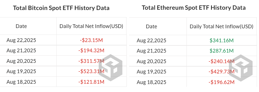 The outflows came amid Bitcoin (BTC) dipping from above $116,000 on Aug.18 to $112,000 by the end of the trading week, while Ether (ETH) tumbled below $4,100 on Tuesday after starting the week at around $4,250, according to CoinGecko.