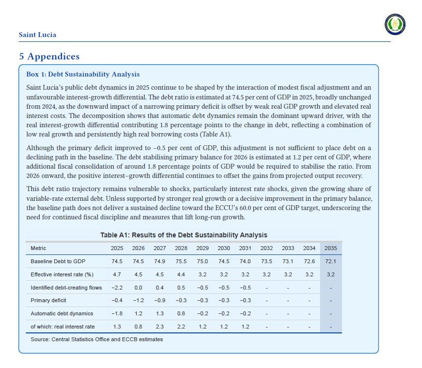 Saint Lucia’s total public sector debt increased to 78.0 percent of GDP in 2025, driven by a combination of capital project disbursements and budget financing. Despite an improvement in the primary balance, the debt ratio is not on track to reach the Eastern Caribbean Currency Union’s (ECCU’s) debt target of 60.0 percent by 2035, according to St Lucia’s Annual Economic and Financial Review, December 2025. ~ ECCB.