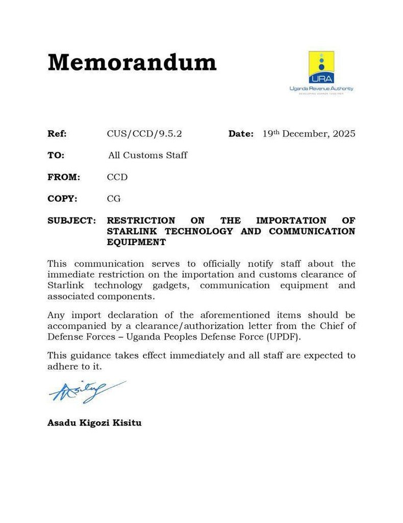 The Uganda Revenue Authority (URA) directive, dated December 19, 2025, instructs all customs officials to block the import of Starlink technology unless importers present a formal clearance or authorisation letter from the Chief of Defence Forces of the Uganda People’s Defence Force (UPDF).