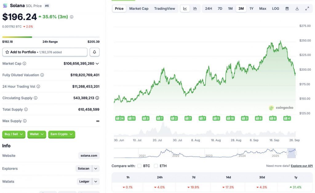 The cryptocurrency market bloodbath seems to have no end in sight. Bitcoin (BTC) has fallen to the $109,000 price level, wiping out all gains made over this month. BTC’s correction has led to the larger crypto market facing substantial liquidations. Solana (SOL) is following the market trend, falling below the $200 mark for the first time since Sept. 7. According to CoinGecko data, Solana’s price has seen a dip of 4% in the last 24 hours, 19.9% in the last week, 17.3% in the 14-day charts, and 4.3% over the previous month.