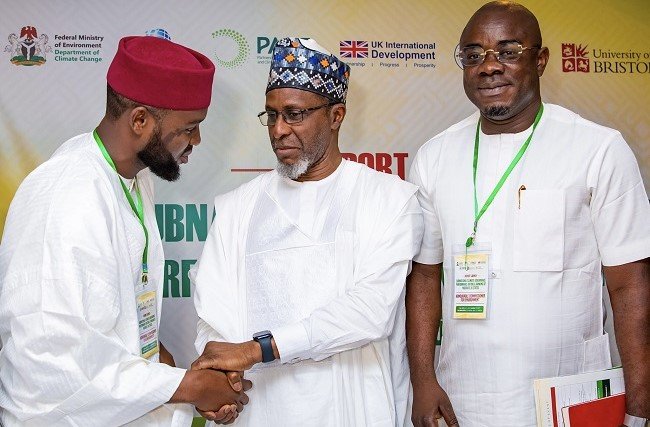 Minister of Environment, Balarabe Abbas Lawal (middle), congratulates Dr. Dahir M. Hashim, the Kano State Commissioner of Environment and Climate Change (left)