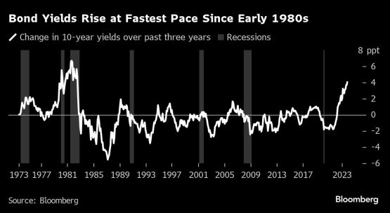 There’s a good reason why investors are amazed that something hasn’t broken in the economy yet: The last time US government bond yields climbed so far, so fast, the nation plunged into back-to-back recessions.