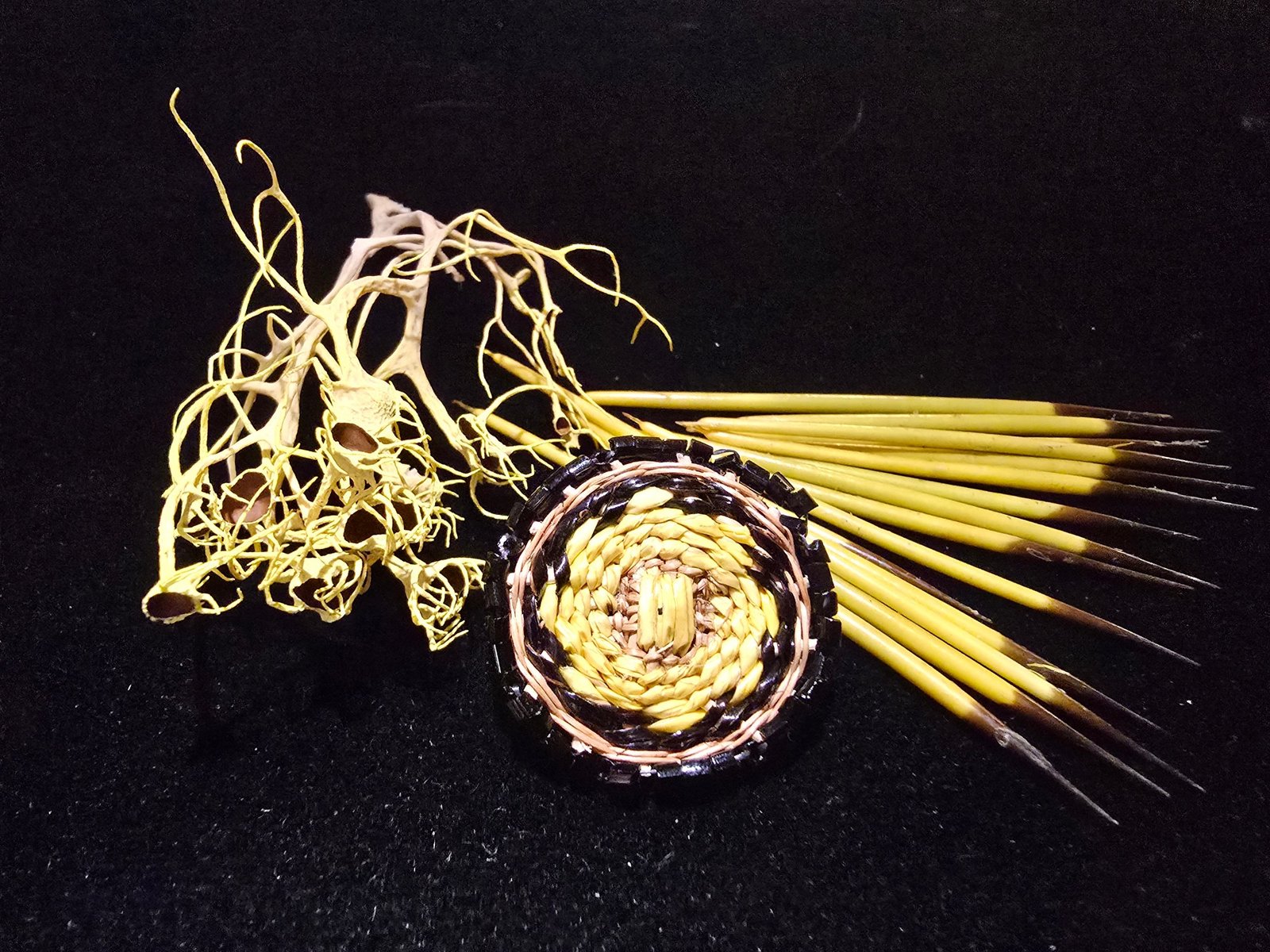 A pin woven with porcupine quills made by Tanna Lindgren-Tripp (Yurok). Similar earrings and pins continue the tradition of incorporating quills into Karuk basketry and art. Wolf lichen (left), a high-elevation fungus that grows on trees in the mountains around Karuk homelands, has long been used as a natural dye, producing the bright yellow color traditionally applied to porcupine quills (right). Credit: Courtesy of Emilio Tripp