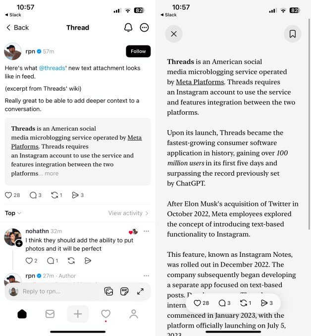Threads is testing a new feature that makes it easy to share long-form text on the social network, Meta confirmed to TechCrunch on Thursday. The feature lets users attach a block of text to a post instead of creating a thread of several different posts when looking to share more in-depth thoughts and ideas.