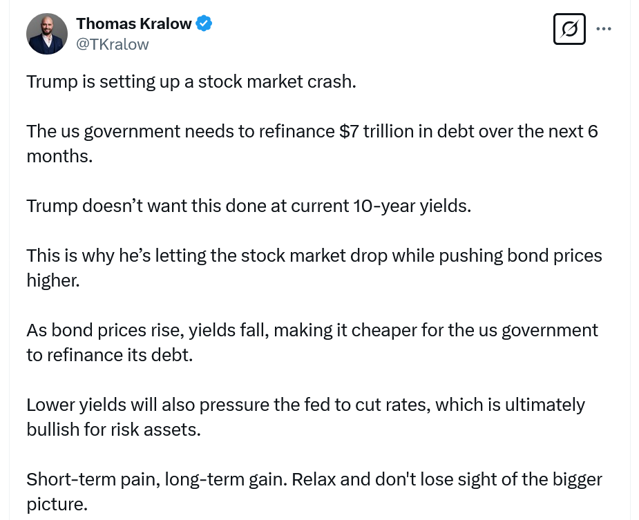 Pompliano said the recent market panic has been driven in part by Trump’s tariffs — and has been used to create a more favorable bond market while lowering the 10-year Treasury yield.