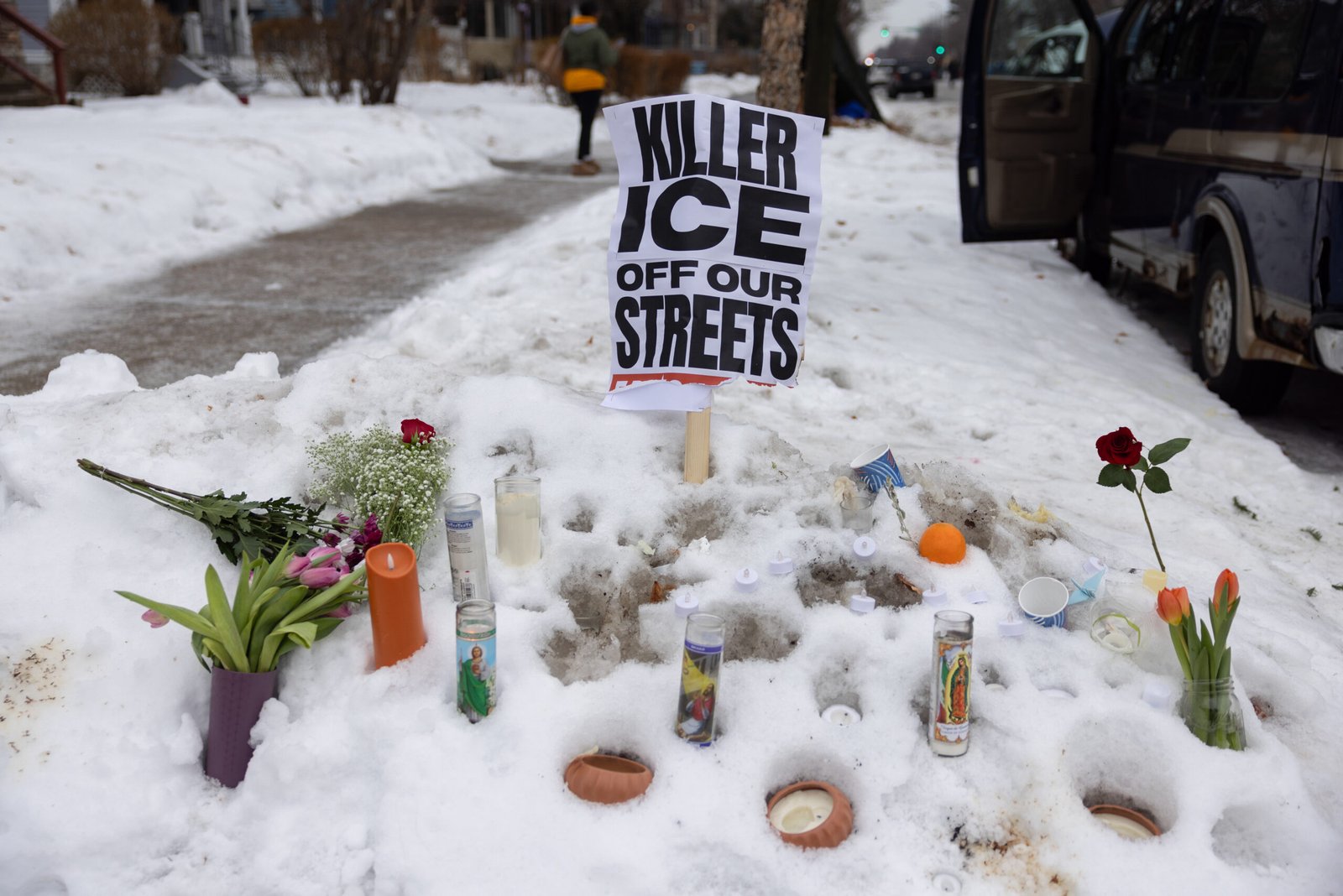 A memorial set up by community members following the fatal shooting of Renee Nicole Good by ICE agent Jonathan Ross in Minneapolis on Jan. 8, 2026. Photo: Jaida Grey Eagle/Bloomberg via Getty Images