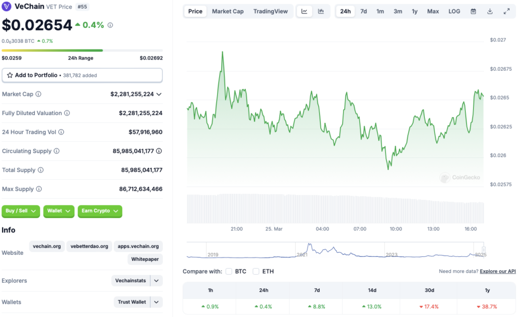 VeChain (VET) is gaining momentum once again after its recent price dip. The asset has rallied 0.4% in the daily charts, 8.8% in the weekly charts, and 13% in the 14-day charts. Despite the rally, VET’s price is still down 17.4% over the previous month and 38.7% since March 2024.