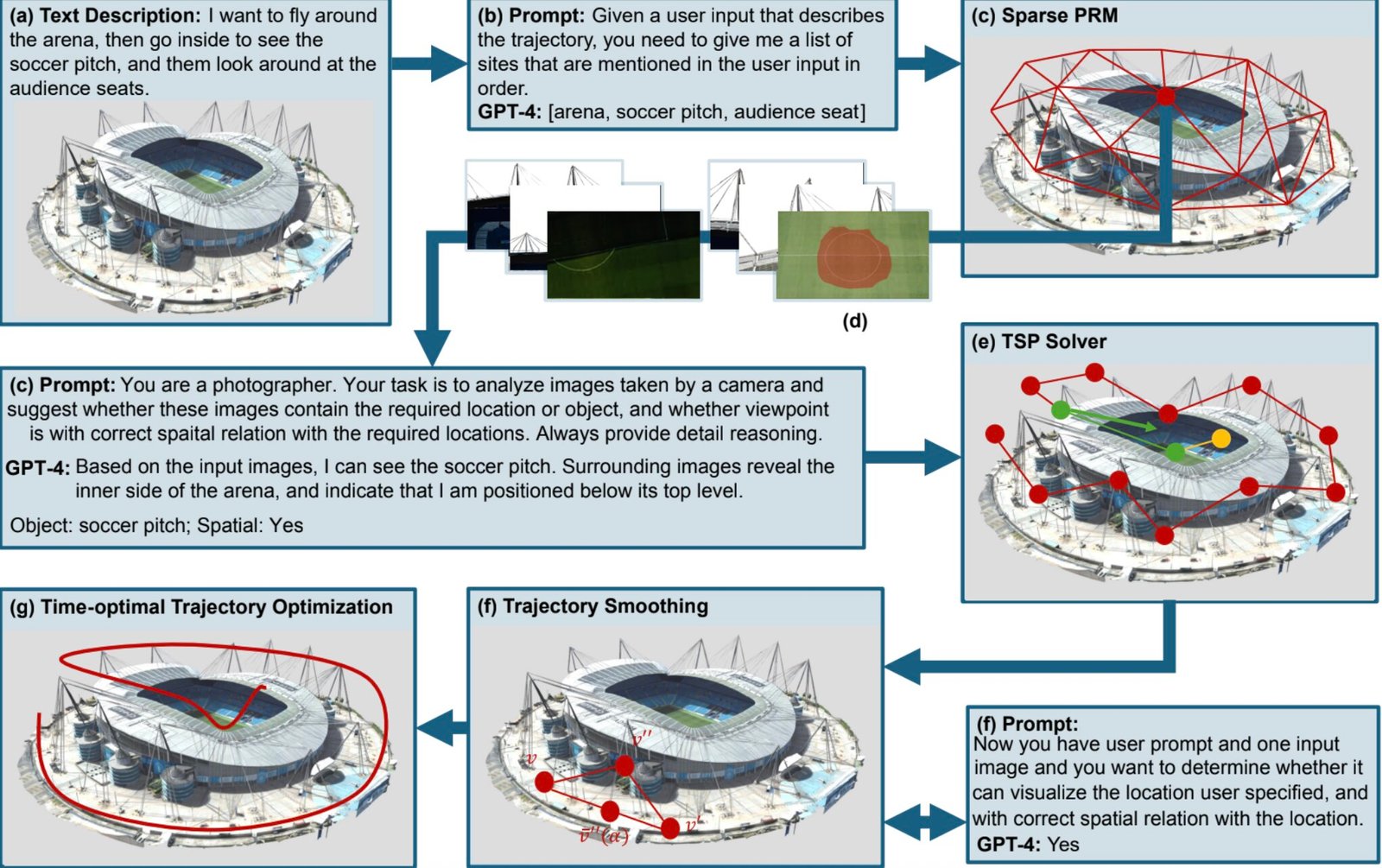 “The model evaluates candidate viewpoints based on semantic alignment, and we further leverage GPT-4o to reason about relative spatial relationships (e.g., inside/outside the target) using multi-view imagery. An optimized 3D inspection trajectory is then generated by solving a Traveling Salesman Problem (TSP) using Mix Integer Programming that accounts for semantic relevance, spatial order, and location constraints.”