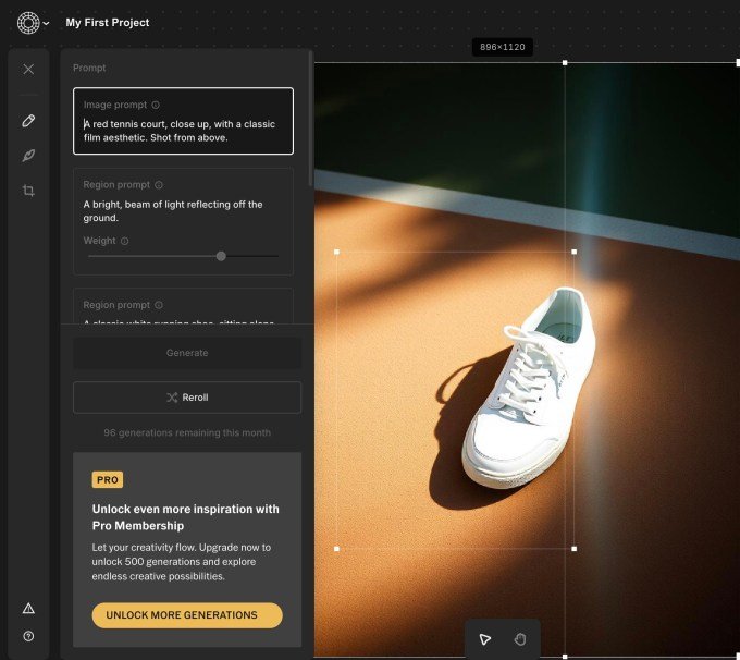 The AI chops come into play when you want to generate images using text prompts. The moodboard also lets you select parts of an image and use a “region prompt” menu to have AI recreate those parts with text prompts. The weights of the region prompt can be adjusted with a slider to generate different versions.