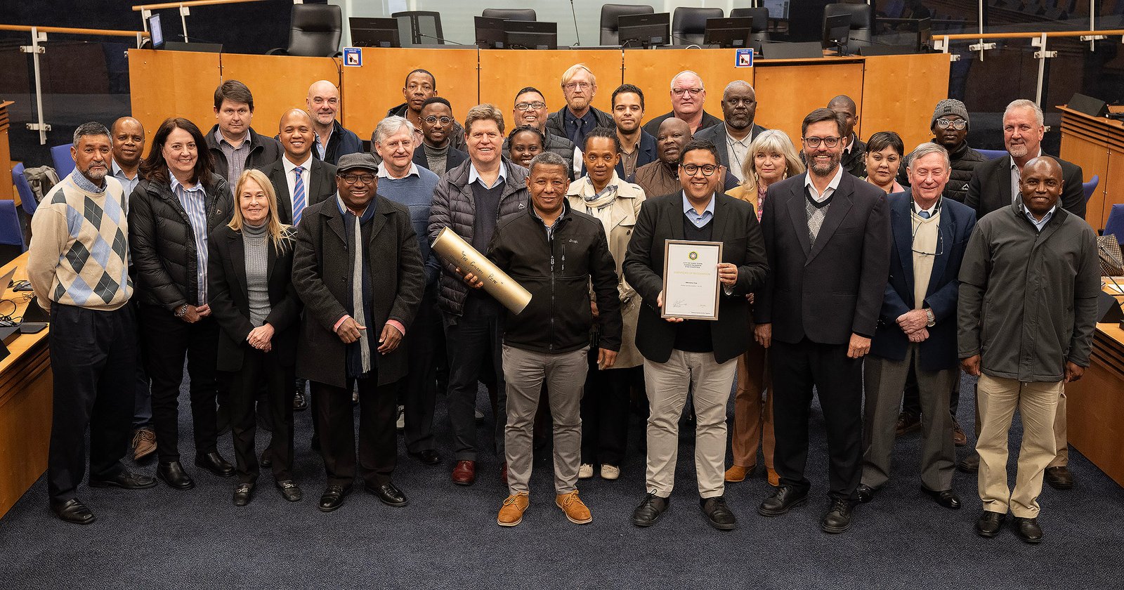 The City’s Water and Sanitation Directorate joins the City’s ‘Billionaires Club’ for achieving over R1 billion in capital spend, honoured during the 30 July 2025 Council meeting. Etienne Hugo (Director: Distribution Services), Councillor Zahid Badroodien (Mayoral Committee Member for Water and Sanitation), and Mayor Geordin Hill-Lewis.