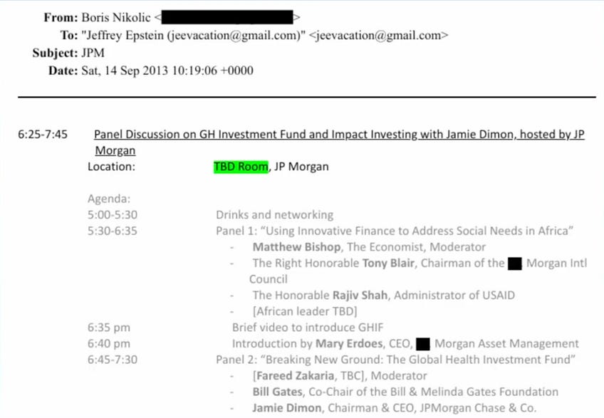 The convergence of health and finance achieves its most concentrated expression in yet another email, in which Nikolic forwards a draft conference agenda. The speaker roster includes Jamie Dimon, chief executive of JPMorgan; former British Prime Minister Tony Blair; the administrator of USAID; and Bill Gates, who was scheduled to present on a “Global Health Investment Fund.” Not a Global Health Fund. A Global Health Investment Fund. The terminology is deliberate and self-revealing. This was not charity. This was a returns-generating financial instrument draped in the vestments of humanitarianism. Physicians were, once again, nowhere in evidence — because when the commodity is health policy rather than health outcomes, the pertinent expertise is financial, not medical.
