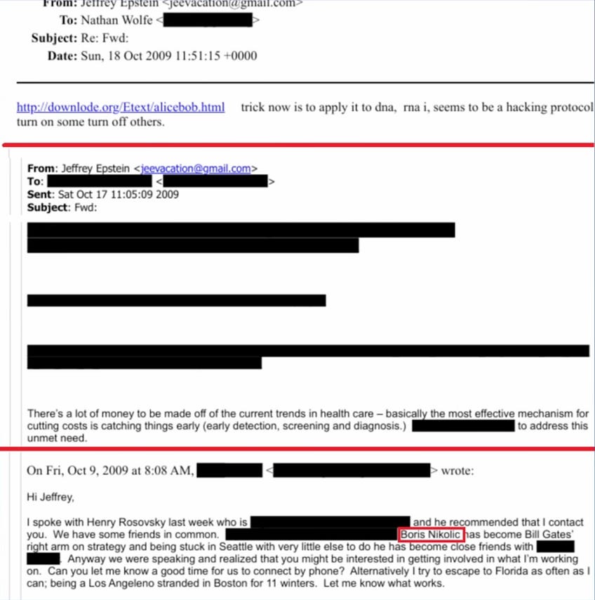 An email exchange dated October 2009 involves the virologist Nathan Wolfe — whose name was redacted in one portion of the document but inadvertently left legible in another. Within the exchange, a correspondent notes that Boris Nikolic has ascended to the position of “the right hand of Bill Gates.” Epstein replies that “current trends in healthcare offer enormous money-making potential” and then invokes a “hacker protocol” applicable to DNA and RNA that would enable one to “switch some on and others off.”