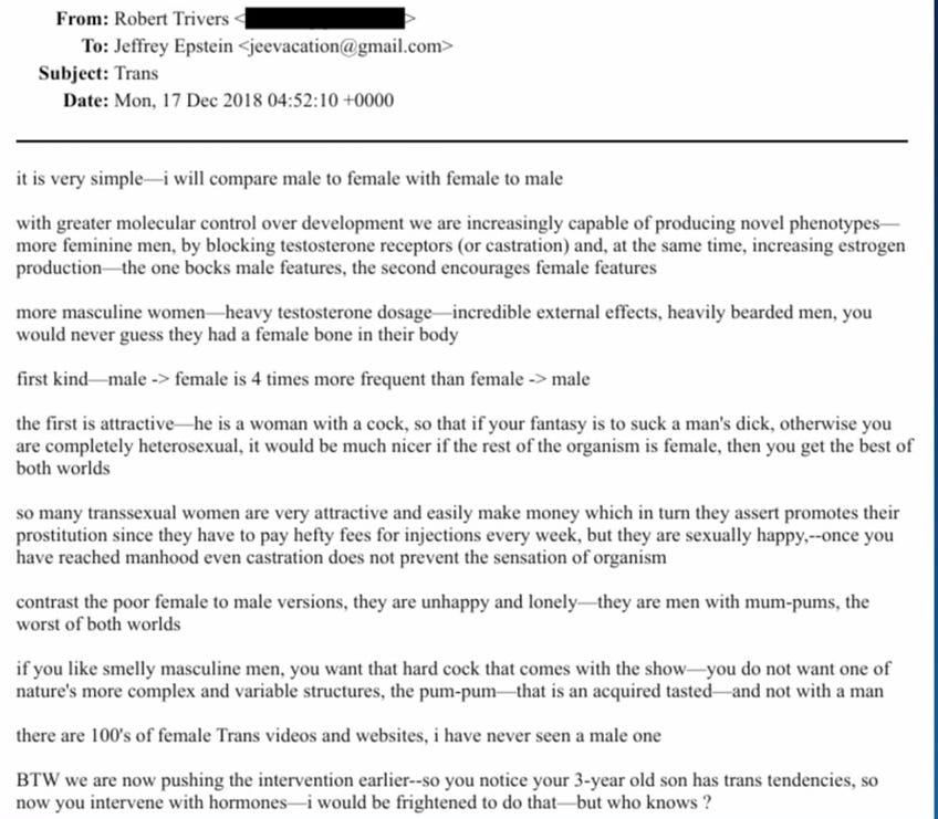 Among the released correspondence is an email from Robert Trivers — the evolutionary biologist celebrated for his foundational contributions to the theory of reciprocal altruism and parent-offspring conflict — addressed to Epstein.