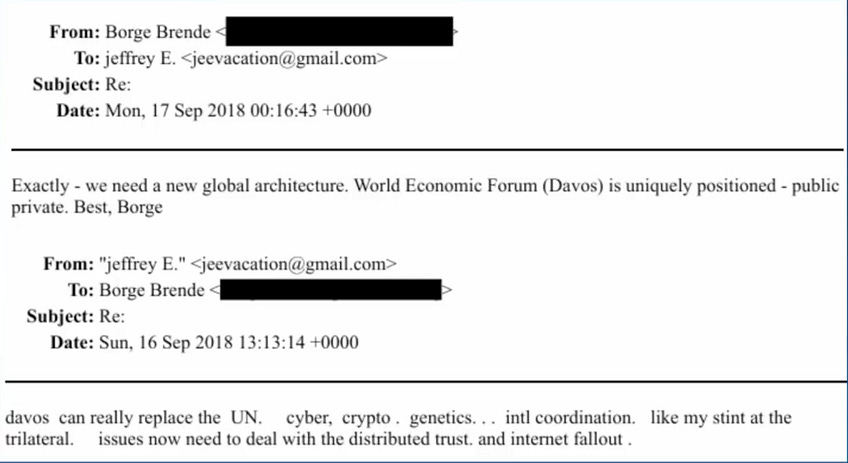 The geopolitical ambitions of this network receive their most unvarnished articulation in a 2018 email from Epstein to Borge Brende, president of the World Economic Forum. Epstein’s proposition dispensed with diplomatic circumlocution entirely: Davos could supplant the United Nations.