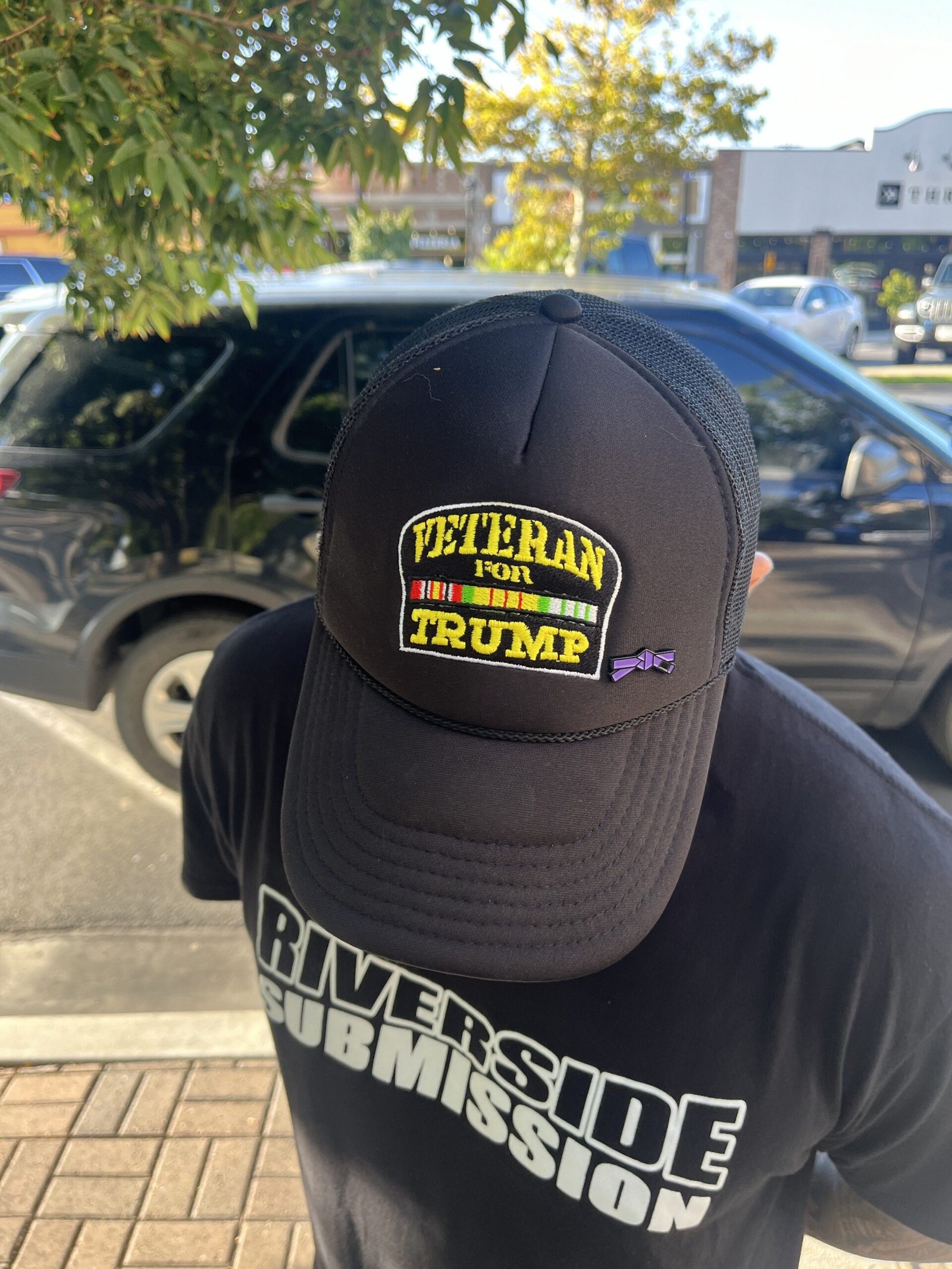 Jaime Fernandez, 31, drove overnight from California to the expo fair to support a friend applying for a job with ICE. Sporting a neat beard, an MMA T-shirt, and a “Veteran for Trump” cap, he threw up two shaka hand signs while posing for a photo.