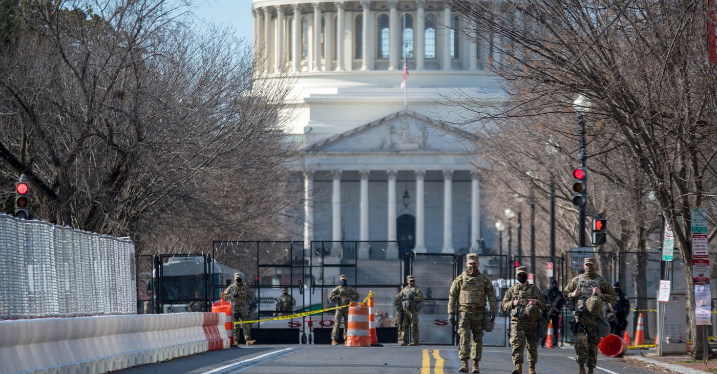 Washington, DC – January 19, 2021: Armed National Guardsmen on security detail at the U.S. Capitol