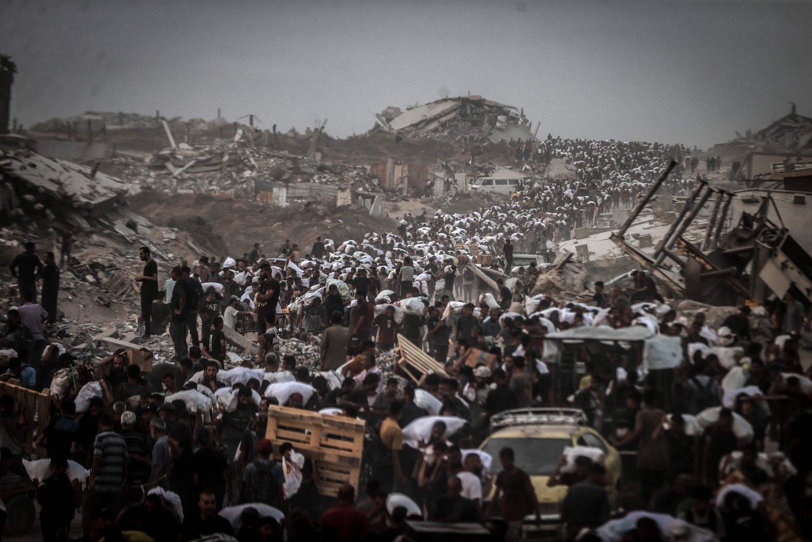 GAZA CITY, GAZA - JULY 29: Palestinians gather at an aid distribution point near the Zikim border crossing in a desperate attempt to receive limited flour supplies in Gaza City, Gaza, on July 29, 2025. Under the ongoing Israeli attacks, civilians in Gaza face severe food shortages, with long queues forming as aid trucks arrive. (Photo by Ali Jadallah/Anadolu via Getty Images)