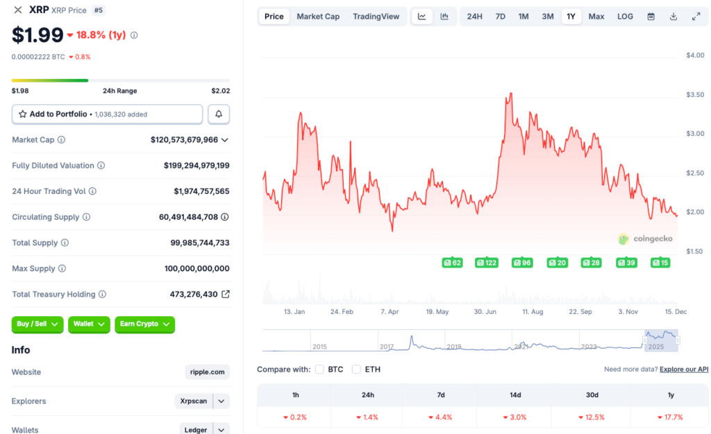 Ripple’s XRP token has once again fallen below the $2 mark. According to CoinGecko data, the popular cryptocurrency is down 1.4% in the last 24 hours, 4.4% in the last week, 3% int he 14-day charts, and 12.5% over the previous month. Despite the ongoing market turmoil, 2025 has been one of the most bullish years for XRP since 2020. The asset breached the $3 mark earlier this year, in January, for the first time in seven years. Let’s discuss why XRP may be nearing a price rebound soon.