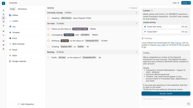 “Our ‘Coworker’ tool integrates across platforms and collaborates with human agents and back-office teams to fully manage the dispute lifecycle while saving time, reducing errors, and maintaining compliance,” said CTO Williams. Currently, the year-old startup is already deployed at customers like U.S. business banking platform Rho and an unnamed Fortune 50 financial institution.